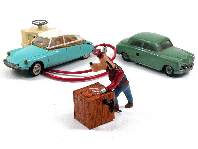 hauteur 12,5 cm - moteur à clef (fonctionne) - avec clef (oxydée) - en action, le personnage fait rouler une caisse d'explosifs devant lui - tête en plastique