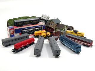 états de 'A' à 'F' - comprend : 3 motrices, 7 wagons, 5 voitures de voyageurs, des rails, 2 transformateurs, un tunnel & une maquette de gare - une motrice & un transformateur avec boîte - on y retrouve les marques : JOUEF, LIMA & FALLER