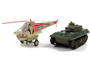 longueur 40,5 cm - moteur à ressort (fonctionne) - 2 pales de rotors cassées & fendues - petites traces d'oxydation sur le moteur - manque les 2 civières avec blessés - en action, l'hélicoptère avance & le rotor tourne