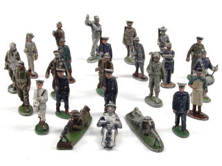 états de 'D' à 'E' - comprend : un tirailleur anglais couché, un officier anglais avec sabre sur l'épaule, 3 parachutistes américains dont un officier, 5 marins dont un officier, 4 aviateurs dont un officier, un mitrailleur Tabor, un fantassin américain, 4 fantassins français, 2 chasseurs à pied dont un avec tambour & l'autre avec cor, un officier des services de santé & un agent de la circulation - petits manques