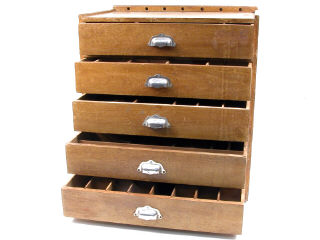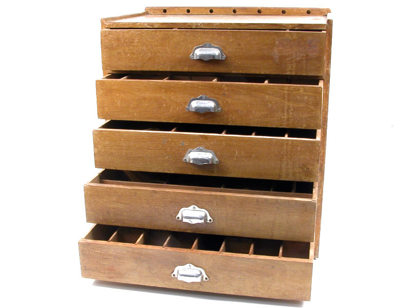 dimensions : 71 x 56 x 52 cm - comprend 5 tiroirs permettant le rangement des pièces - manque le panneau de présentation & le panonceau - contient un ensemble important de pièces détachées & visserie
