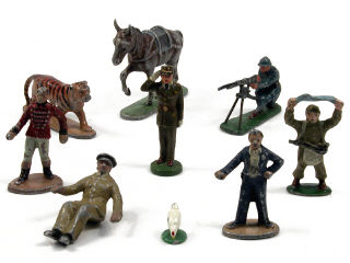 états de 'B' à 'E' - comprend : le Général de GAULLE au salut, un parachutiste au combat, un mitrailleur, Monsieur Loyal, le dompteur KLAUS, un conducteur de chariot de gare, une mule, un tigre & une poule - manque 2 bâtons