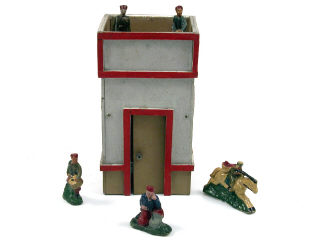 dimensions : 13 x 14 x 49 cm - mât oxydé - on y joint 4 zouaves en composition & un cavalier arabe (avec manques)