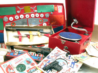 états de 'A' à 'D' - comprend : un tourne-disques avec disques, 2 carabines à fléchettes, un établi avec outils, une mitrailleuse, un jeu de construction 'BOB', un projecteur, des jeux de l'oie en carton, etc..- 5 éléments en boîte - petits manques - petites traces d'oxydation sur certains éléments
