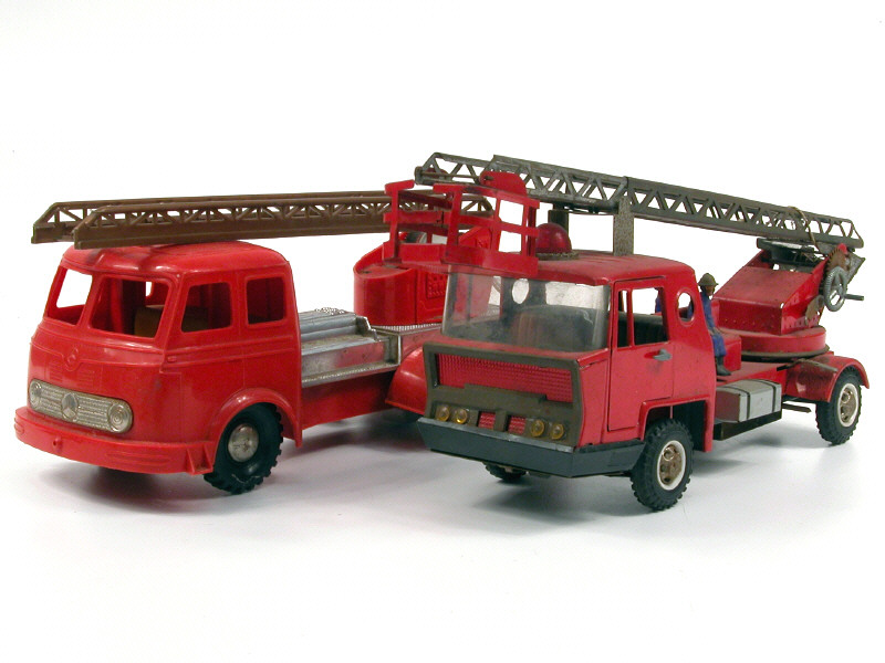 longueur 33 cm - moteur à clef (fonctionne) - fabrication plastique souple - manque la 2ème partie de l'échelle - 3 barreaux fendus sur l'échelle principale - petites traces d'oxydation sur 3 enjoliveurs de roue