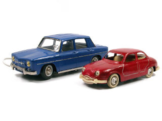 longueur 25 cm - version économique avec moteur à friction (fonctionne), sans phare électrique, sans vitre, sans direction & avec pare-chocs en plastique brut - traces d'oxydation - une petite fêlure sur 2 éléments de calandre