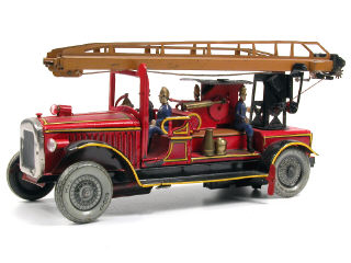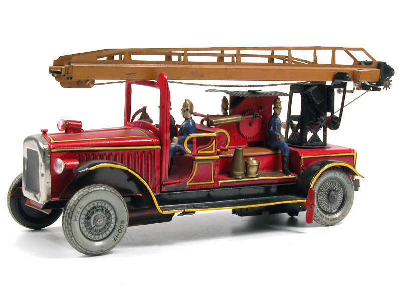 longueur 36 cm - moteur à ressort (fonctionne) - avec bruiteur & 4 pompiers - véhicule entièrement restauré - une roue non d'origine