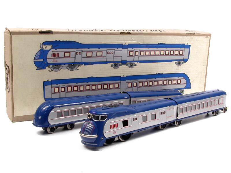 longueur 108 cm - écartement O - fabrication contemporaine - moteur électrique non testé - traces d'oxydation sur 2 éléments avec retouches & une partie repeinte - traces de métal fatigue sur 5 roues - manque 4 ressorts de soufflets