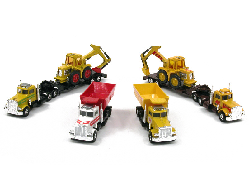comprend 2 camions-bennes carrière & 2 camions-remorques surbaissées transport d'engins