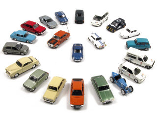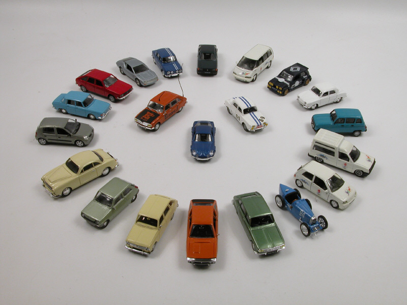 miniatures reproduisant les modèles : RENAULT, BUGATTI, FORD & ALPINE - on y retrouve notamment les marques : ELIGOR, NOREV & SOLIDO - petits manques - un modèle repeint - includes the aforementioned models and makes