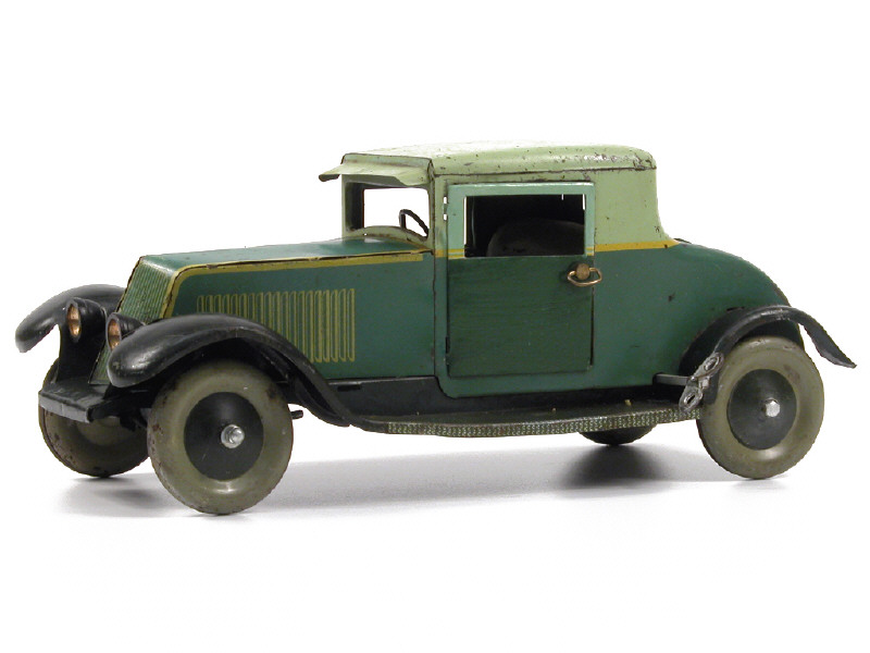 longueur 30 cm - moteur à ressort (à revoir) - avec direction - 2 portes, phares, colonne de direction avec volant & quelques fixations non d'origine - manque chauffeur - parties repeintes