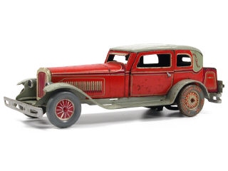 longueur 47 cm - moteur à clef (à revoir) - en tôle lithographiée - avec direction, chauffeur & malle arrière ouvrante - parties repeintes - traces d'oxydation - petits éléments non d'origine