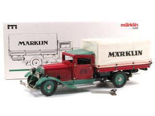 longueur 42,5 cm - moteur à clef (fonctionne) - avec éclairage des phares, direction par le volant & levier de marche/arrêt, notice, clef & certificat de série limitée à 6666 exemplaires - ce modèle est une réédition réalisée en 1992 d'un camion fabriqué avant-guerre - SUPERBE REALISATION !