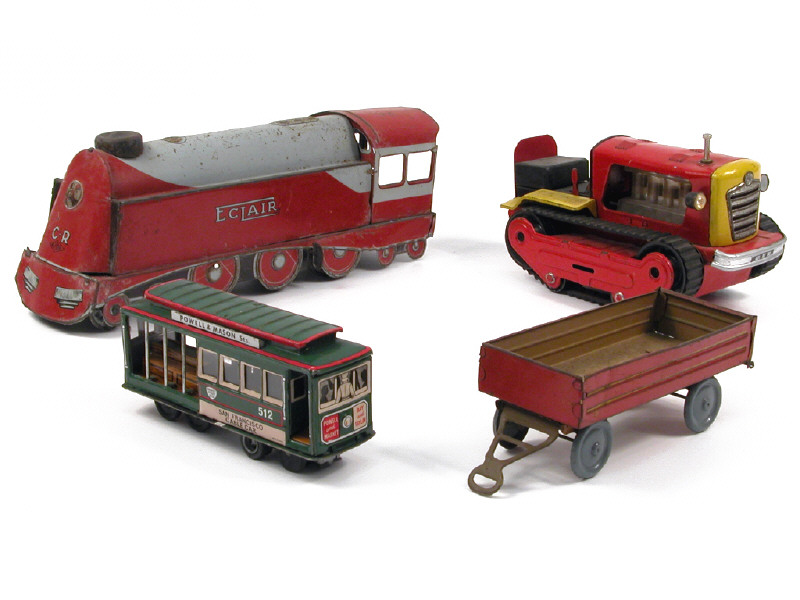 DIVERS Ensemble d'un bulldozer, une locomotive à vapeur, un tramway & une remorque
