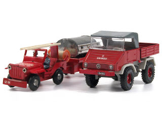JOYAX (FRANCE) JEEP de pompiers avec remorque-citerne en tôle rouge