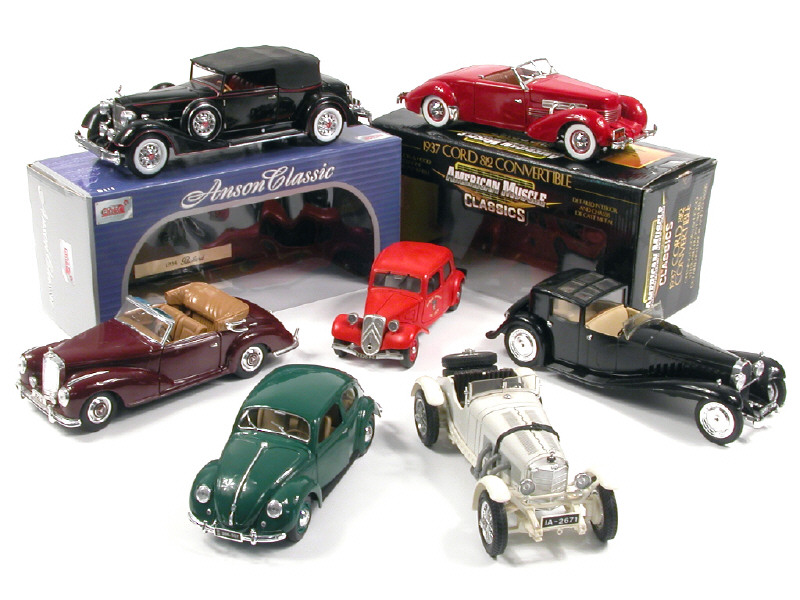 échelles 1/18ème à 1/21ème - miniatures reproduisant les modèles : VOLKSWAGEN, PACKARD, MERCEDES, BUGATTI, CITROËN & CORD - on y retrouve les marques : ANSON, MAISTO, BBURAGO, SOLIDO, ERTL & CHAMPION - 2 modèles avec boîte - un sigle de calandre non d'origine - pneus coupés sur un modèle