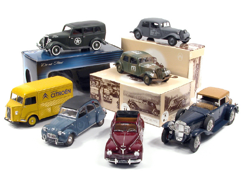 échelles 1/17ème à 1/21ème - miniatures reproduisant les modèles : CITROËN, FORD, PEUGEOT & DUESENBERG - on y retrouve les marques : SOLIDO, HUBLEY & ELIGOR - 3 modèles avec boîte - un véhicule en état 'R' & transformé - manque un rétroviseur & une poignée de portière sur 2 voitures