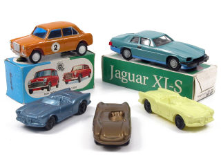 miniatures reproduisant les modèles : JAGUAR, MG, ALFA ROMEO & PORSCHE - on y retrouve les marques : ANKER, VERCOR & HECCO - 2 modèles avec boîte - avec manques sur un véhicule