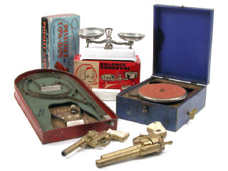 états de 'B' à 'E' - comprend : une balance 'ROBERVAL' avec poids, un tourne-disques, une paire de pistolets & un billard mécanique - 2 éléments avec boîte - petits manques - traces d'oxydation