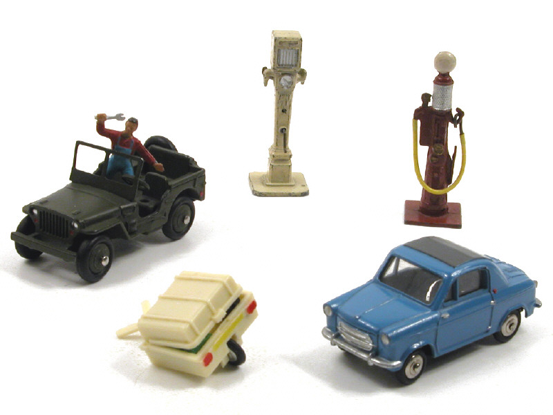 manque pilote - petits détails de peinture rouge ajoutés - on y joint 2 pompes à essence, une remorque monoroue avec 3 bagages & une figurine de la marque STARLUX