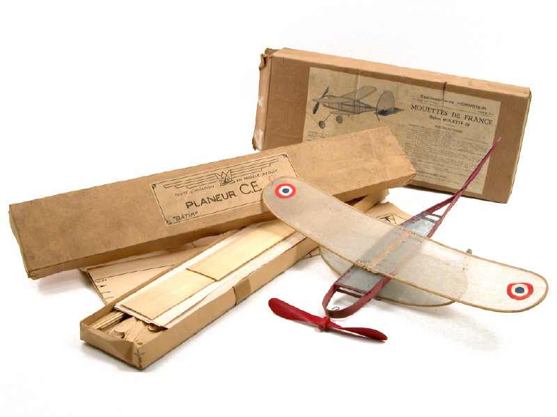 envergure 42 cm - avec moteur à élastique (manque élastique) - notice de montage & d'utilisation collée sur la boîte