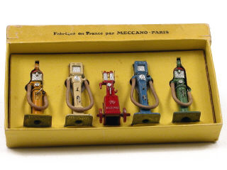 version avec boîte jaune de 1949-1951 & cale de présentation non imprimée - contient les références : 49A (une jaune 'B' & une verte 'C'), 49B (rouge 'A-' & manque tuyau) & 49C (une bleue 'C' & une crème 'C') - 4 pompes avec tuyau - petites traces de métal fatigue sur 2 modèles - SUPERBE ENSEMBLE !