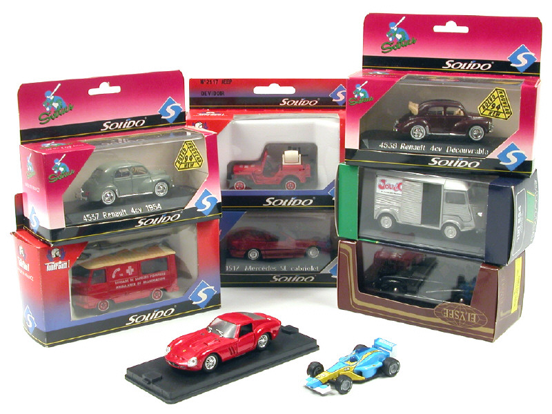 comprend : JEEP WILLYS, CITROËN 1200kg, PEUGEOT J9, RENAULT 4CV (2 exemplaires différents), MERCEDES SL cabriolet, PEUGEOT 203 cabriolet, FERRARI 250 GTO & RENAULT F1 - on y retrouve les marques : SOLIDO, ELYSEE, ELIGOR, UNIVERSAL HOBBIES & VEREM