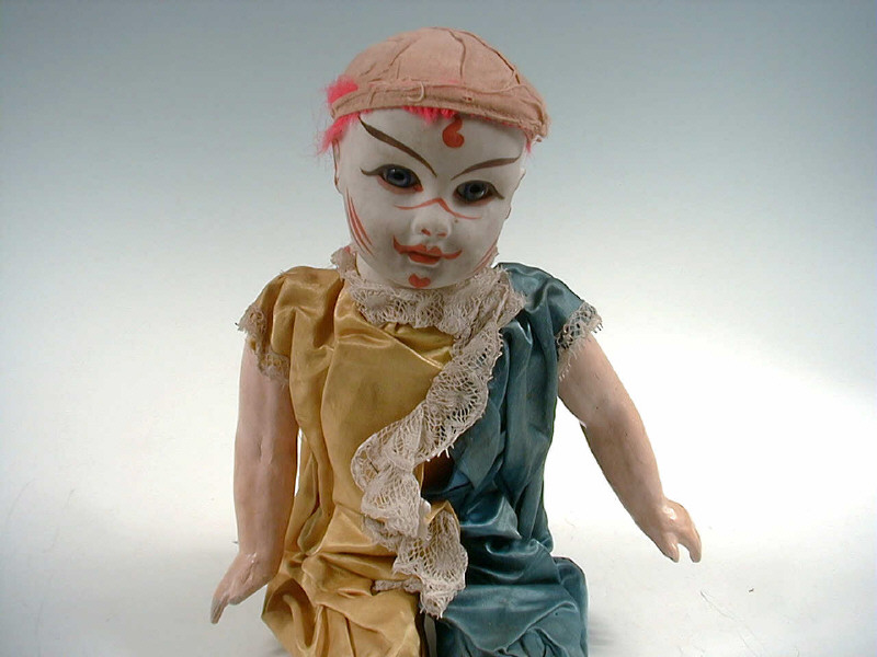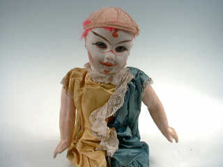 moule A 7 - tête blanche avec décor rouge, bouche fermée, yeux fixes bleus en émail - corps droit en composition, habit d'origine (H 36 cm)