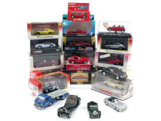 miniatures reproduisant les modèles : DATSUN, FORD, LANCIA, MERCEDES, ALFA ROMEO, BUGATTI, MG, TOYOTA, CITROËN, AC COBRA, LOLA, JAGUAR & MINI - on y retrouve les marques : SOLIDO, JOUEF EVOLUTION, MERCURY, DINKY-MATCHBOX, CORGI TOYS, KYOSHO, CONRAD, AQUAVIT, POLITOYS, BANG & BEST MODEL - 3 véhicules sans boîte - manque 2 boîtes-vitrines & une autre non conforme