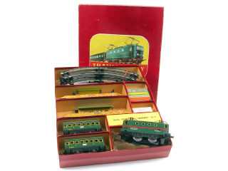 contient : une motrice BB-8051 (moteur à clef fonctionne) avec clef, 2 voitures de voyageurs de 2ème classe, 6 rails courbes, 2 rails droits, une boîte de 8 broches d'assemblage, un abri de quai, une petite gare, 2 signaux de voie, un poste d'aiguillage & une notice