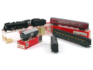 comprend : une locomotive vapeur type 141 avec tender, une voiture de voyageurs de première classe, une voiture-restaurant, un wagon-fourgon & un wagon à bagages - une boîte non d'origine - un modèle en état 'R' de la marque MACKET & un autre avec toit repeint & inscriptions effacées