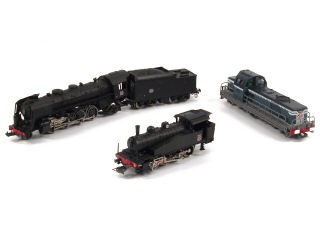 comprend : une locomotive vapeur type 141 avec tender, une locomotive vapeur type 040 & une motrice type BB66150 - petits manques sur un modèle - 2 boîtes non d'origine