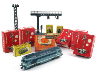 états de 'A' à 'C' - comprend : une motrice BB 68001, 3 commandes à distance, 6 signaux lumineux, une tour avec 3 projecteurs, 3 boîtes de figurines & une potence avec signaux tricolores - on y joint 2 boîtes dont une avec des essieux - on y retrouve notamment les marques : MÄRKLIN, PREISER, HORNBY & FLEISCHMANN - 10 éléments avec boîte