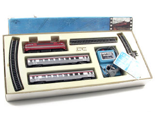 contient : une motrice électrique BB-9240, 2 voitures de voyageurs, un transformateur, 12 rails courbes, 2 rails droits & une notice