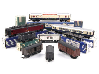 comprend : une voiture panoramique, une voiture de première classe, un wagon postal, un wagon-tombereau, un wagon-plateau à ranchers (manque 5 ranchers) & 4 wagons-fourgons - une boîte en état 'c' & une autre en état 'd'