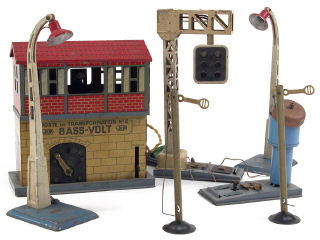 états de 'D' à 'E' - comprend : un transformateur n°2 en forme de poste d'aiguillage (une commande cassée), une signal sonore de voie, 2 lampadaires simples, 2 signaux de voie & un signal à 6 feux sur potence - traces d'oxydation - parties repeintes sur un élément - petits manques