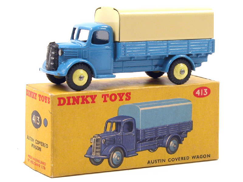 DINKY TOYS (GB) 413 AUSTIN Plateau bâché bleu moyen, bâche crème & jantes jaune citron