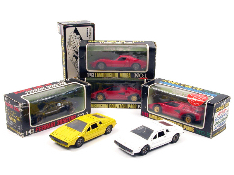 miniatures reproduisant les modèles : FERRARI, LAMBORGHINI & LOTUS - 2 véhicules de la marque ASAHI dont un sans boîte - retouches d'usine sur 4 voitures - une boîte en état 'b' - roues non d'origine sur un modèle