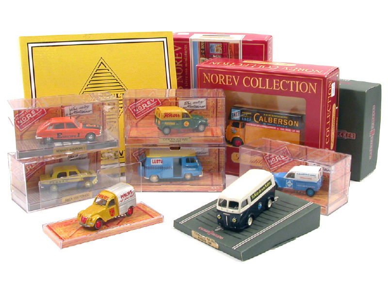 comprend : 3 CITROËN 2 CV fourgonnette 'PHILIPS', 'KNORR' & 'CAMPING GAZ', RENAULT 16 'EUROPE 1', SIMCA 1000 'PERNOD', RENAULT ESTAFETTE 'LUSTUCRU', CHENARD & WALKER 'LA VOIX DE SON MAITRE' & SAVIEM GS4 fourgon 'CALBERSON' - les décors représentent une agence 'RENAULT' & un garage 'CITROËN' - une boîte en état 'c'