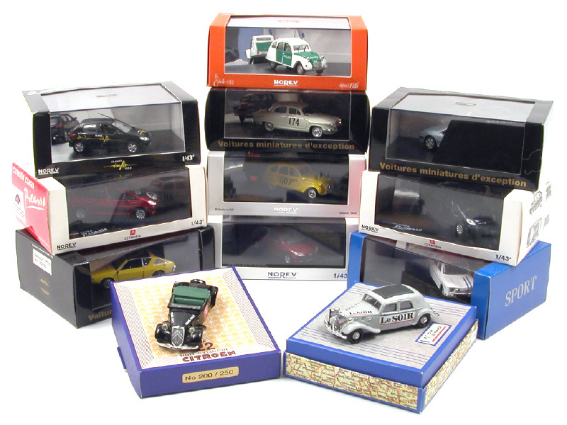comprend : PEUGEOT 607, 2 PEUGEOT 206 dont une 'FRANCE INFOS', 2 CITROËN tractions, 2 CITROËN 2CV une 007 & une autre 'POLIZEI', PANHARD PL17, RENAULT 8 GORDINI, RENAULT 17TS & 2 CITROËN XARA PICASSO dont une voiture en série limitée numérotée 23/250 exemplaires