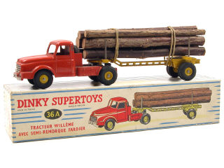 DINKY TOYS (FRANCE) 36A WILLEME Fardier (version avec jantes convexes & remorque ajourée) orange & jaune