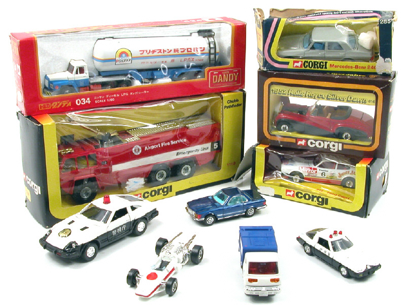 miniatures reproduisant les modèles : MAZDA, HONDA, DATSUN, FORD, MERCEDES, ROLLS ROYCE, ISUZU, CHUBB & NISSAN : on y retrouve les marques : CORGI TOYS, YONEZAWA DIAPET & TOMICA DANDY - 3 boîtes en état 'c'