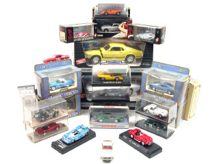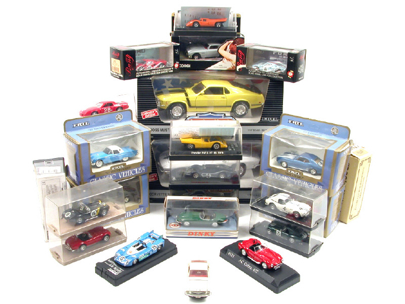 miniatures reproduisant les modèles : AC, FORD, MATRA, PORSCHE, MERCEDES, JAGUAR, CHEVROLET, PONTIAC & ASTON MARTIN - on y retrouve les marques : DINKY MATCHBOX, DINKY TOYS, SOLIDO, ERTL, BANG, JOUEF EVOLUTION, CORGI TOYS, BROOKLIN & MODEL BOX - 2 voitures à l'échelle 1/18ème - un véhicule sans boîte en état 'D'