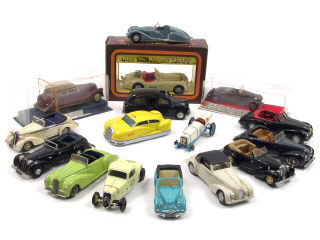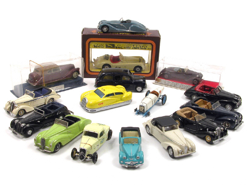 miniatures reproduisant les modèles : CITROËN, DELAGE, STANLEY (2 roues à recoller), RENAULT, AUSTIN, PANHARD, HOTCHKISS, JAGUAR, TALBOT LAGO & DELAHAYE - on y retrouve notamment les marques : BELLE EPOQUE, CORGI TOYS, DINKY TOYS, CJM, AUTOMANY, CANAL +, IDEM, MIKANSUE & CCCF - 2 véhicules avec boîte - la plupart sont des kits montés