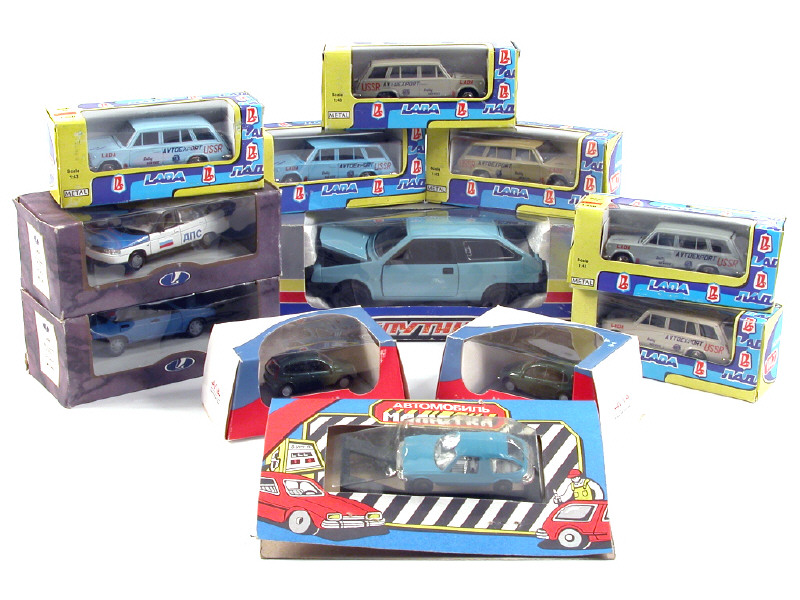 comprend : 9 VAZ (LADA) dont 6 breaks 2102 (référence A11) avec logos de couleurs différentes, une 2109, une 2101 en état 'B' avec une trace de colle sur le pare-brise & une 2108 à l'échelle 1/24ème - 2 AVVA à l'échelle 1/66ème & une AMC PACER sous blister de marques indéterminées