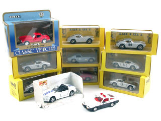 miniatures représentant les modèles : FERRARI, CHRYSLER & NISSAN - on y retrouve les marques : IDEA 3, ERTL, MAISTO & TOMICA DANDY - 3 boîtes en état 'c'