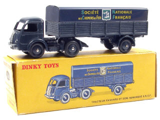 DINKY TOYS (FRANCE) 32AB PANHARD Semi-remorque 'S.N.C.F' (version avec intérieur de toit quadrillé) bleu foncé (fond de l'écusson quadrillé)
