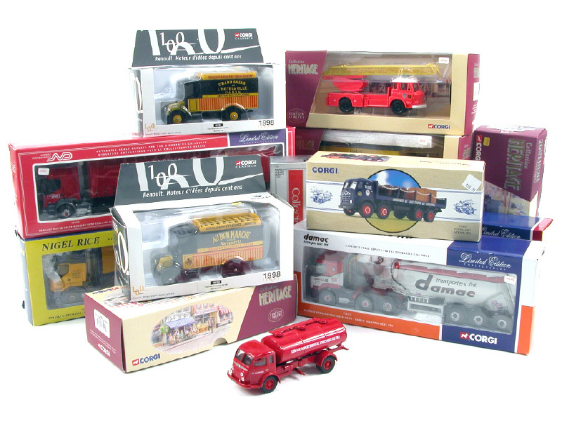 comprend : PREMIUM (4 exemplaires), FAINEANT citerne 'SDI DU VAR', 1000 kg avec remorque 'RENAULT CINEMA', KZ 'AU BON MARCHE', KZ 'GRAND BAZAR DE L'HOTEL DE VILLE', SAVIEM JL grande échelle de pompiers, SAVIEM JL fourgon 'MICHELIN' & voiture de 1910 - on y joint un FODEN plateau-brasseur 'MOORE Ltd' & un BERNARD 110 fourgon 'LUSTUCRU'