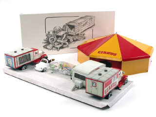 contient : 2 camions (un fourgon loges & un cage), une VOLKSWAGEN 1300, une caravane, un chapiteau démontable & un sachet de figurines