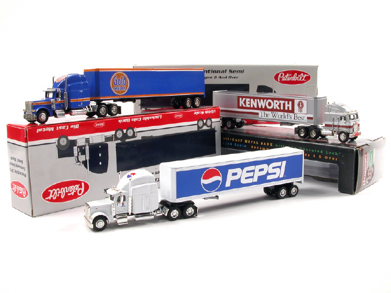 miniatures reproduisant les modèles PETERBILT & KENWORTH - on y retrouve les publicités : 'GOLD MEDAL', 'PEPSI' & 'KENWORTH' - un camion faisant office de tirelire